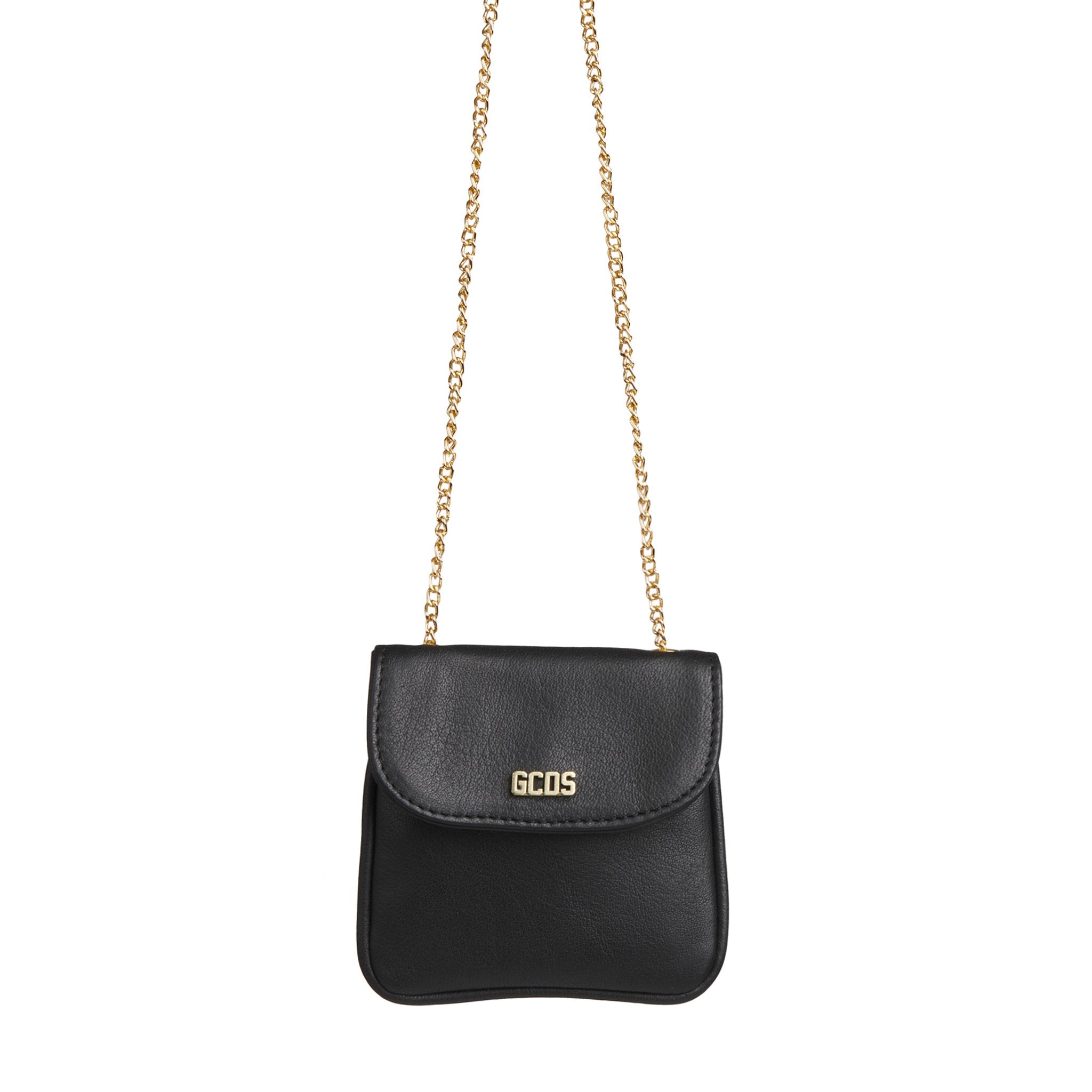 Small Bag for your credit cards with gold chain and gold logo on the front.
