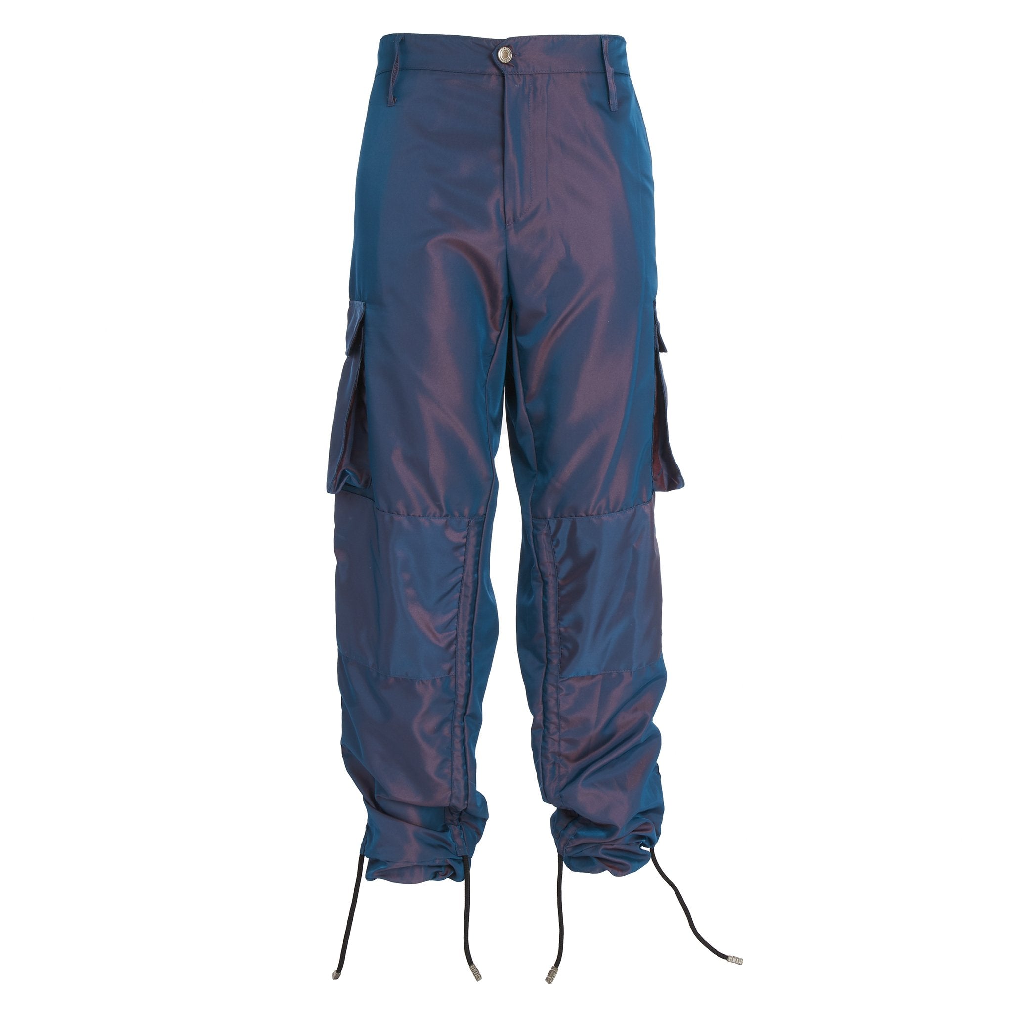 Our Cargo Iridescent Pants with carabiner detail. Coin Cat embroidered and two big pockets are sewn on the sides. Man Fit.
