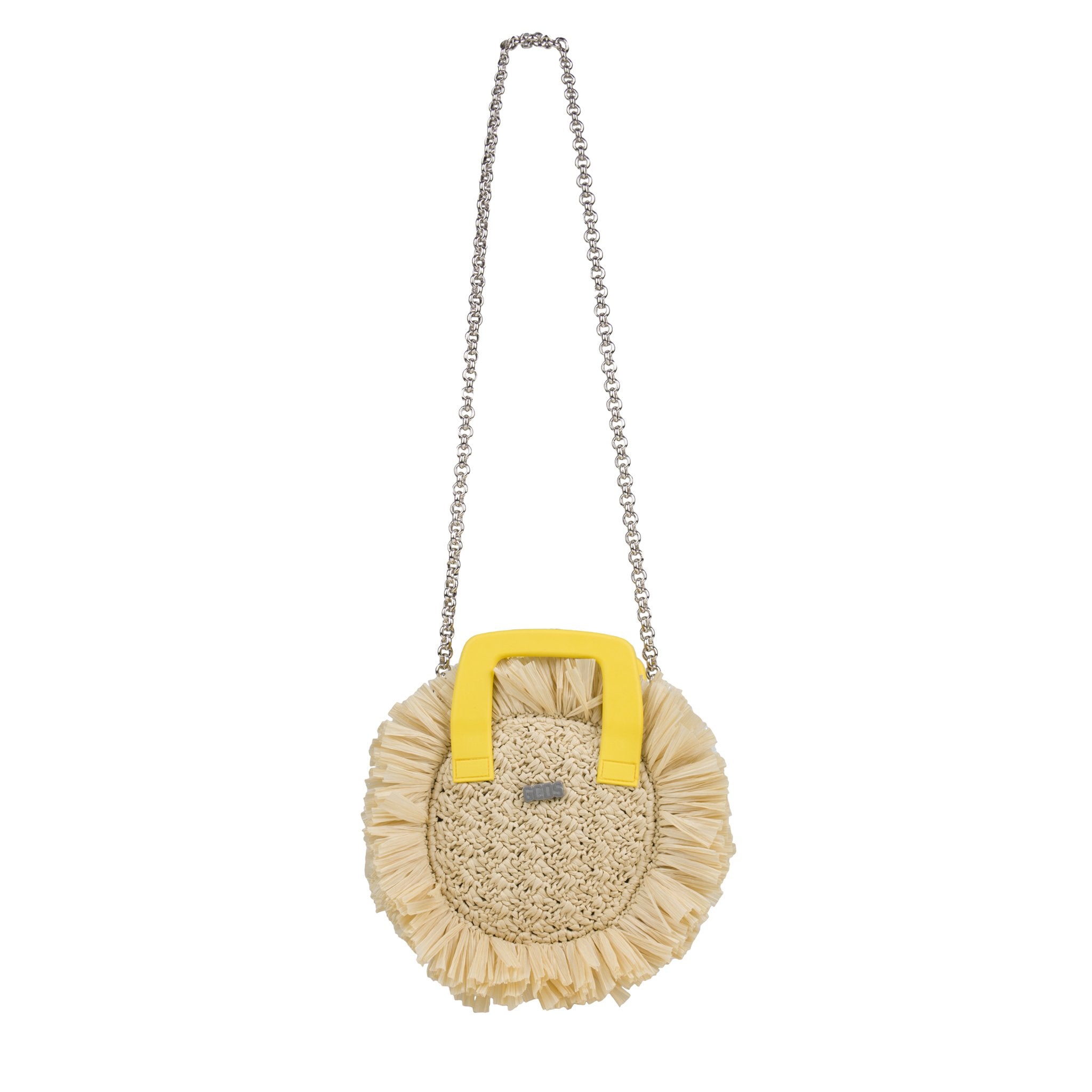GCDS Cute Roundy Bag with small handles and chain shoulder strap. Rouches all around.